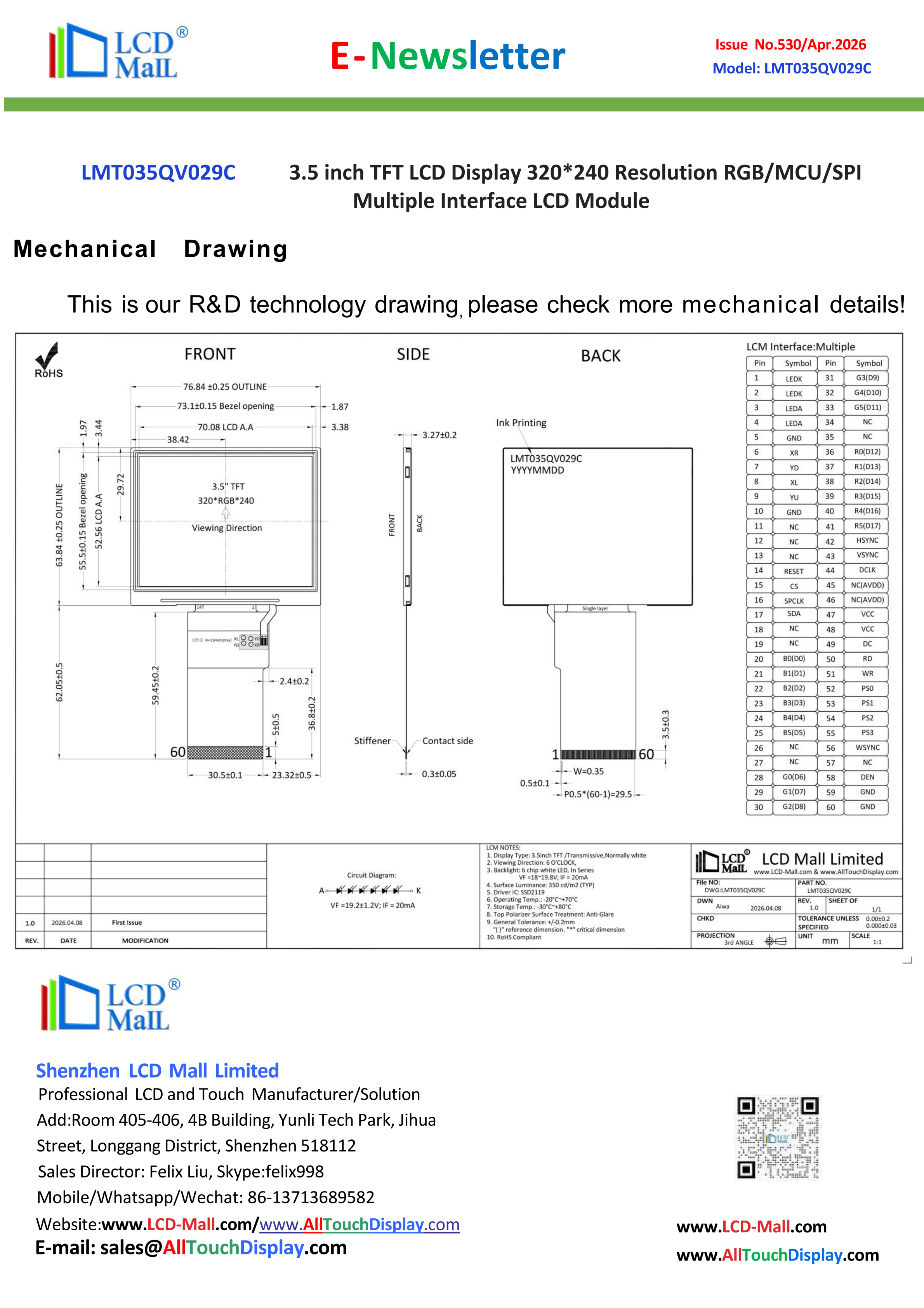 3.5 inch TFT LCD Display 320*240 Resolution RGB/MCU/SPI Multiple Interface LCD Module