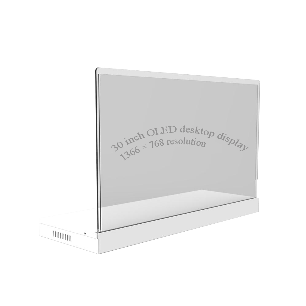 Transparent OLED desktop display screen adopts self luminous OLED technology, ultra-high screen transparency, combined with first-class bonding technology and perfect industrial design, to achieve ultra-thin integrated transparent design, allowing viewers to experience stunning and shocking visual effects. Create a strong blended stereoscopic visual effect. It can be widely used in high-end retail, luxury goods/precious metals/jewelry display, exhibition halls, etc.