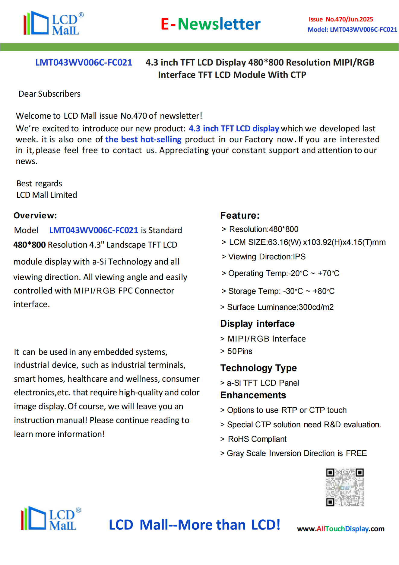Home  >  NEWS  >  4.3 inch TFT LCD Display 480*800 Resolution MIPI/RGB Interface TFT LCD Module With CTP