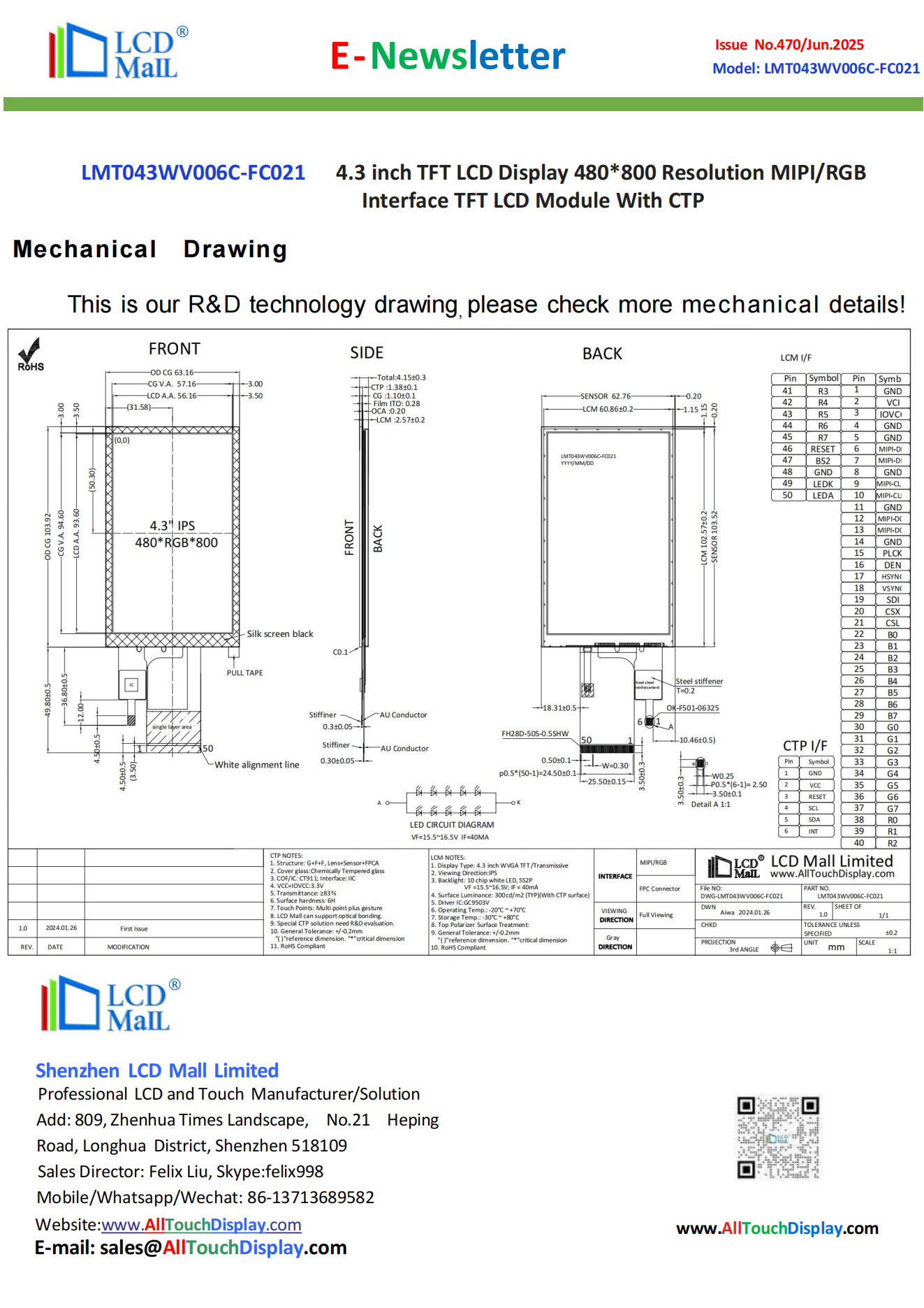 4.3 inch TFT LCD Display 480*800 Resolution MIPI/RGB Interface TFT LCD Module With CTP