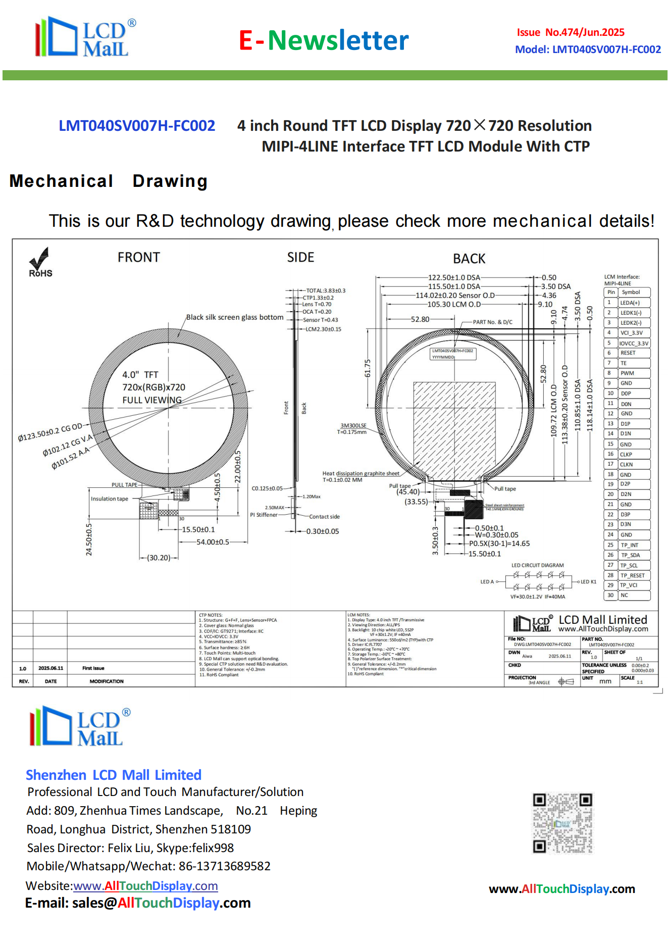 4 inch Round TFT LCD Display 720×720 Resolution MIPI-4LINE Interface TFT LCD Module With CTP
