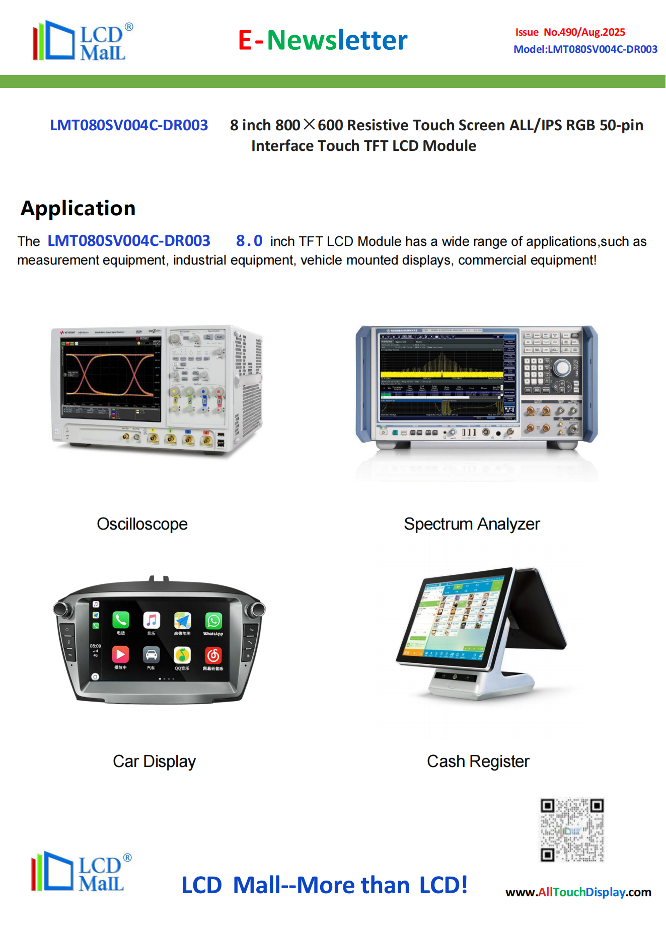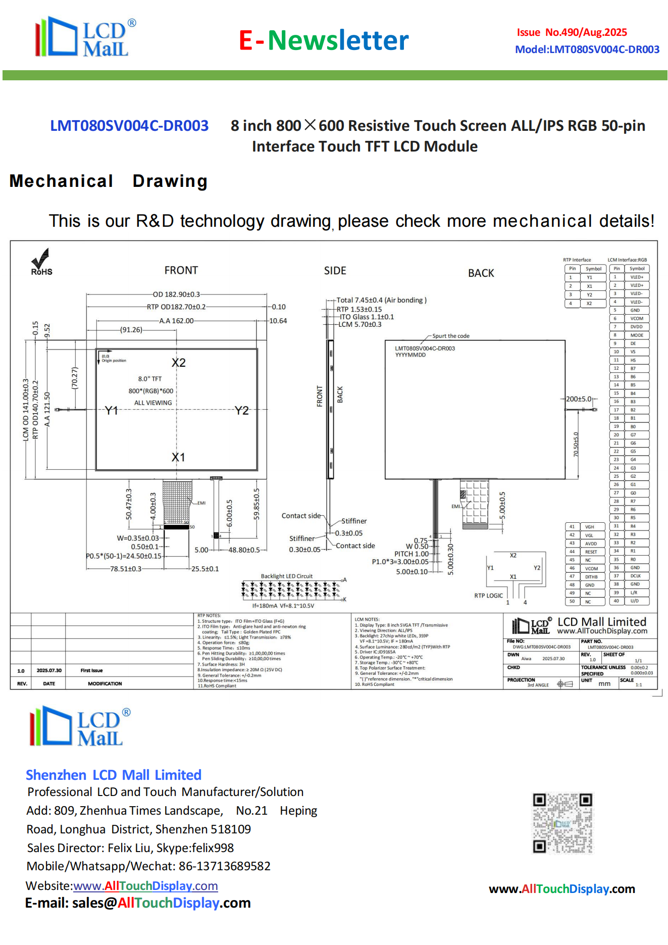 8 inch 800×600 Resistive Touch Screen ALL/IPS RGB 50-pin Interface Touch TFT LCD Module